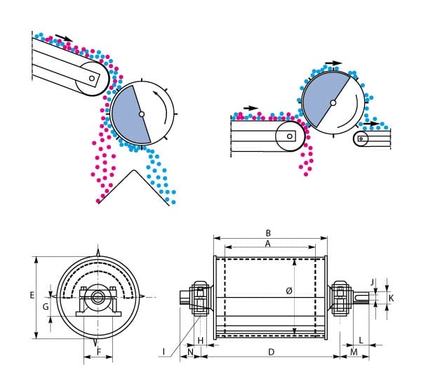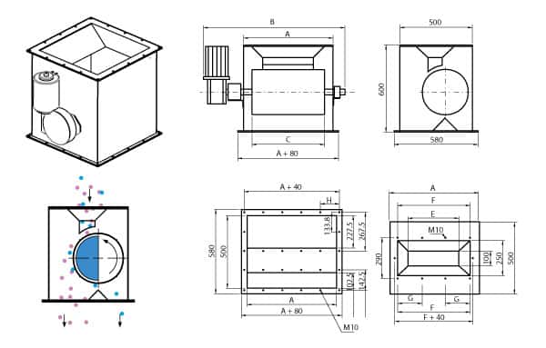 | N° art. | Ø | capacité max m3/h | vitesse rotation t/min | puissance du moteur kW | A | B | D | E | F | G | H | I | J | K | L | M | N | masse (kg) |